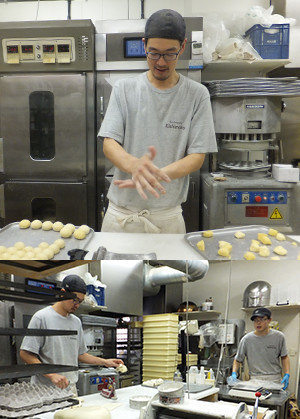 バックヤードをのぞくと若い職人と2人で、パンづくりに集中していた。たった2人で100種類のパンをつくるのは並大抵のことではない。パンづくりの工程表は岸本シェフの頭の中に叩き込まれているから、2人の動きに無駄はない。分割機を活用しながらも、ものすごいスピードでパンをつくっていく。