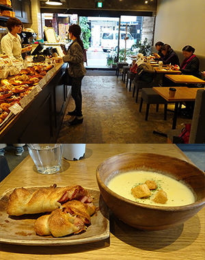 アレンジコーヒーやスープ類も充実。取材日は秋真っ盛りで、「鳴門金時いものポタージュ」を提供していたが、レストラン出身だけに、その味は本格的だ。また子供用のドリンク類は100円と嬉しい価格に設定。ソフトクリームも揃えており、朝食からランチタイム、ティータイムと、使い勝手の良い店として常に近隣の人たちで賑わっている。