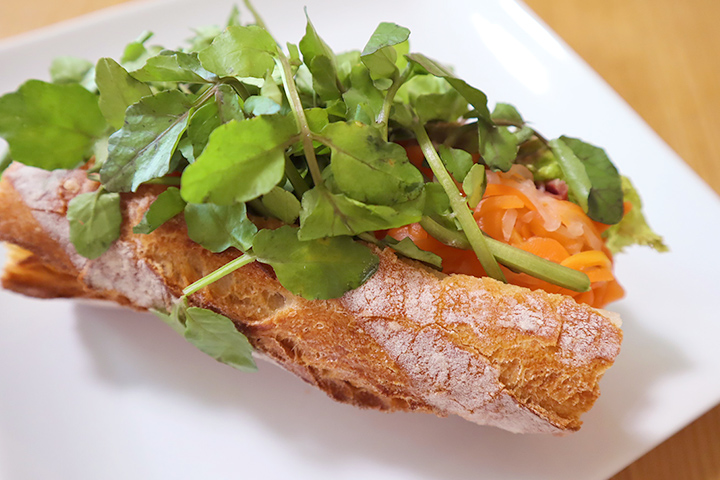 バゲットクーにパストラミビーフと、大根、ニンジンのなますをたっぷりはさみました。ナンプラーを使った自家製のたれで和えたなますは、ほどよいエスニックテイスト。仕上げにはクレソンをたっぷり添えています。これから冬に向かって地元産の船橋にんじんや大根が旬を迎えます。採れたての野菜で、ますますおいしくなること請け合い。バゲットクーは、クラストはガリッとハード。かめばかむほどうまみが出てくる私のお気に入りです。