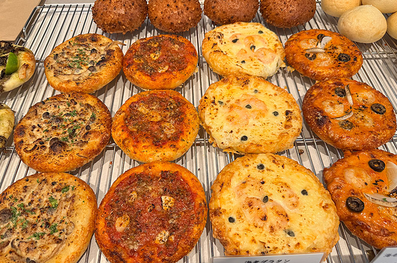 そのすぐ奥に進むと、色とりどりのフォカッチャが並ぶエリアが広がります。店主が元ロブション出身ということもあり、惣菜パンがまるで料理のように華やかに並びます。訪れた日には9種類ものフォカッチャが並び、見た目にも美しいラインナップ。