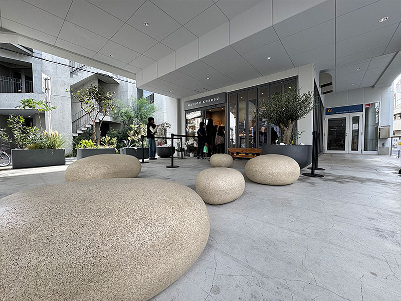 さらに、店外には「テラス」と呼ばれるイートインスペースが設けられています。外に置かれた大きな石はそのまま椅子として利用でき、自然と調和したデザインが印象的です。周囲にはオリーブをはじめとする観葉植物が配置されており、都心にいながらも穏やかな時間を過ごせる癒しの空間になっています。
