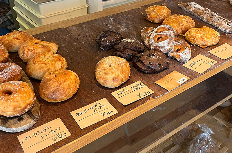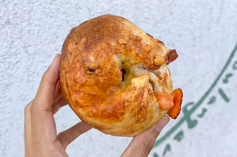 ひと口食べた瞬間に驚くのは、その圧倒的な「ヒキ」の強さと、瑞々しい「もちもち感」。その秘密を伺うと、なんと「湯種を約50%配合している」とのこと。通常よりもかなり高い比率の湯種を使うことで、あのもっちりとした食感を生み出しているのです。さらに驚くべきは、その製法。「発酵しきる前に茹でて、そのままオーブンで焼く」という独自のプロセスを採用しています。シェフが惚れ込んだ「香りの強い粉」のポテンシャルを最大限に引き出すために、引き算を重ねてたどり着いたレシピです。 「成形は得意じゃなくて(笑)」と謙遜されますが、あえてきっちりとまとめすぎないことで、チーズがとろりと溢れ出し、焼けたチーズの香ばしさが食欲をそそる、唯一無二の魅力になっています。