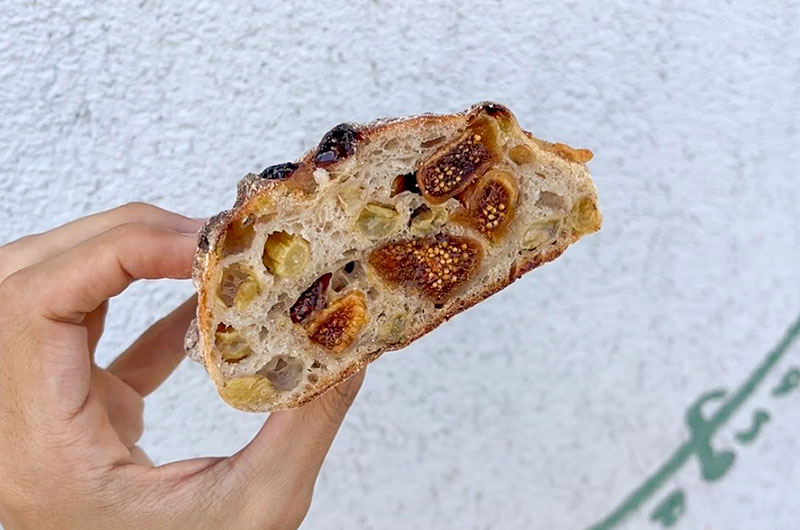 クラムの艶やかな気泡と、吸いつくような食感。 こちらの生地は加水率約90%。シェフは「そこまで高加水ではない」と話しますが、それでも高い水分量を維持しつつ成形するには技術が必要です。日々の気温や湿度に合わせ、手の感触で水分調整を行っているそうです。特筆すべきは、フルーツのジューシーさ。 実は、ドライフルーツを前処理(漬け込みなど)せず、「ドライのまま」生地に混ぜ込んでいるのです。その分、生地に加える水分量をプラスして調整。発酵の過程で、フルーツが生地の中の水分をゆっくりと吸うことで、果実の味が水っぽくならず、素材の甘みが凝縮されたジューシーな食感が生まれるのです。「手間を省いているだけ」と笑うシェフですが、結果として素材の個性が際立つ、独自の工夫が光る一品に仕上がっています。