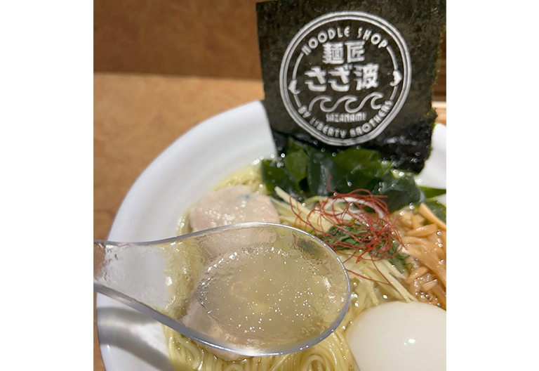 麵匠 さざ波」のいちおしは、「澄み渡る“極”塩らぁめん」。蒲田にある深夜から朝にかけて食べられる他店のラーメンは「とんこつ」と「つけめん」のため、差別化のためにさっぱりとした「塩」にしたのだそう。また、塩ラーメンはシンプルで誤魔化しが効かないため「今まで色々なジャンルのお店で修行をさせてもらったからこそ、あえて塩ラーメンを看板商品にしてチャレンジしようと思いました」と、小林さんは語ります。