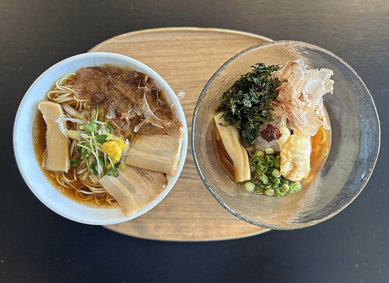 メニューは温冷どちらも楽しめる「朝ラーメンセット」と、温の単品「ゆず香るカツオだし醬油ラーメン」、冷の単品「天磯おろし冷ラーメン」の3品構成です。本場の藤枝では、温も冷も通常の一杯分を「おかわり」して二杯楽しみますが、まる藤ラーメンでは食べやすいようセットは「ハーフサイズの温・冷を一杯ずつ」用意しています。