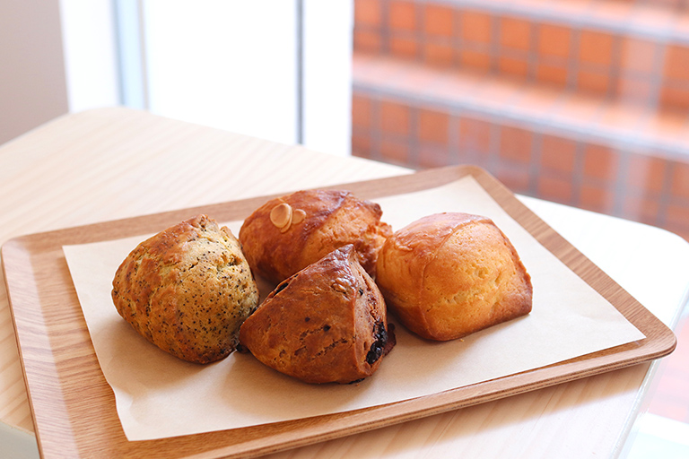 「スコーンそれぞれが違う粉のバランスでできています。小麦粉100%でつくるものもありますが、それはむしろ少数派です。粉の種類によって、サクサク、しっとり、ほろほろと食感がまったく異なるので、食べ比べても楽しいと思います」