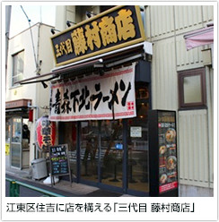 その下北半島の中心に位置し、漁業・水産業で盛んな青森県むつ市で人気のもつ焼き店が「三代目 藤村商店」。この店で煮干を効かせたラーメンを提供したところ人気メニューとなり、「この味は東京でも支持されるのでは?」と、2015年5月、東京・住吉でラーメン専門店「三代目 藤村商店」がオープンしました。
