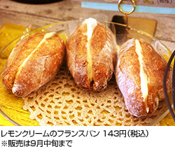 夏季限定のアイテムとしては、爽やかな酸味のレモンクリームを使ったパンも登場します。メロンパンならぬ「レモンパン」は、中にレモンクリーム、外側にクッキー生地をのせて焼いてあります。少し小ぶりにつくってあり、暑い季節にちょっと甘いものがほしくなったときにぴったり。ほかにもバゲットにレモンクリームをはさんだ「レモンクリームのフランスパン」、シチリアレモンのシートを折り込んだラウンド食パンや、シチリアレモンのクリームをたっぷり詰めたコロネも。